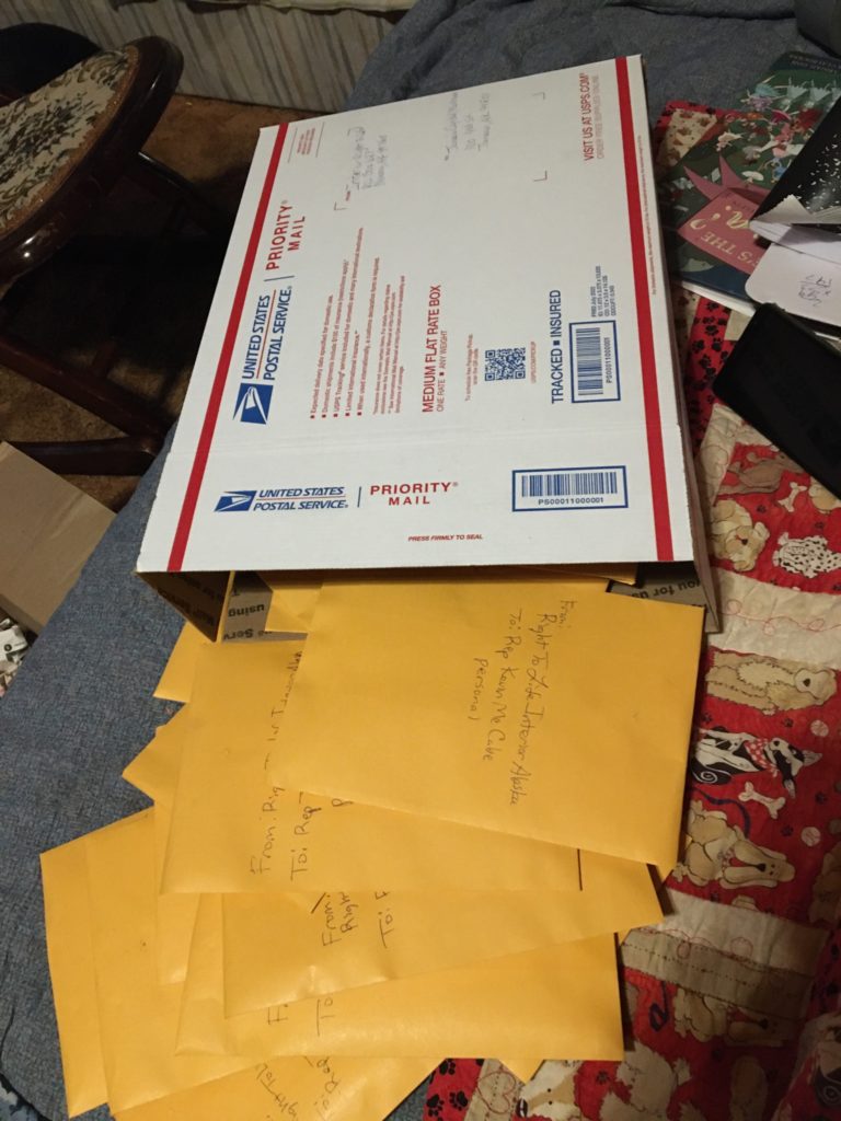 I have taken every letter given to me plus those of you who also wrote your own, and tomorrow this package is heading to the Juneau capital. There are countless letters in this box with legislatures’ names on them and individual messages with baby socks included.